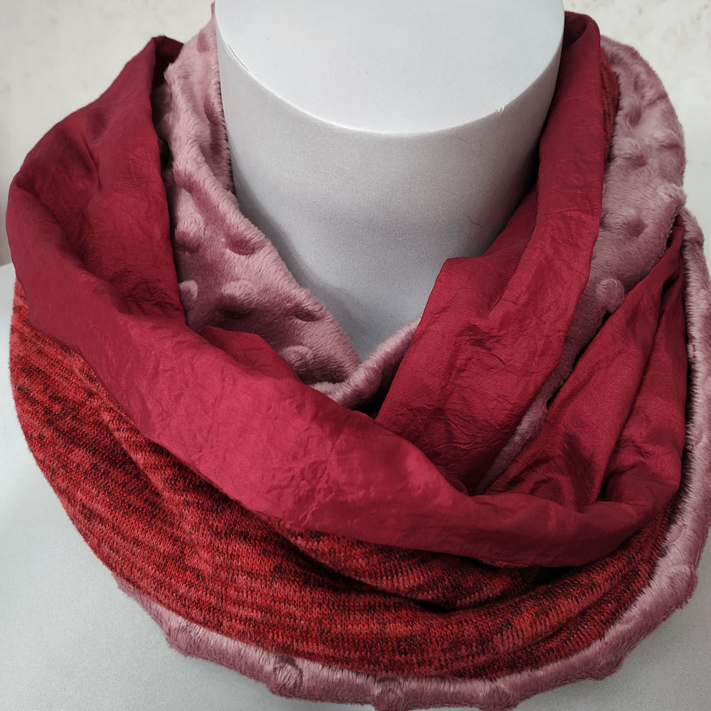 Der kuschelige rosefarbige Fleece wird von einem meliertem Strick unseren bewährten Taftstoff in dem schönen Himbeerton begleitet. Ein sehr angenehm leichter Loop!