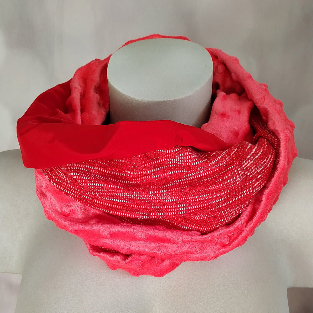 Der hellrote Taft, trifft auf den kuscheligen Fleece in Korallerot und das ganze wird mit dem melierten Strick zu einer harmonischen Einheit.